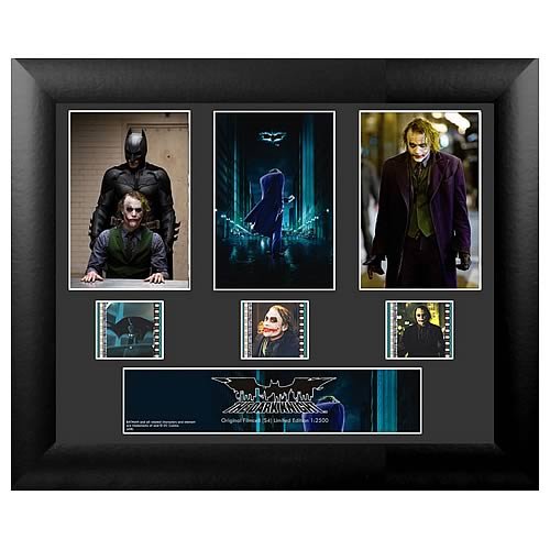 The Dark Knight. Measures 10-inches tall x 19-inches wide. Perfect for displaying in your home or at the office, all the elements are framed in black wood and includes a certificate of authenticity. Gotham City is under siege once again and it's time for Bruce Wayne (Christian Bale) to put on his bat-costume and do battle with two evil enemies: The Joker (Heath Ledger) and district-attorney-turned-villain Two-Face (Aaron Eckhart).