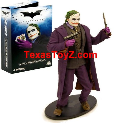 Dark Knight The Joker (Heath Ledger) 1/6 Scale Collector Figure Doll = with real cloth outfit! Looks just like him! Extremely RARE!!by DC DIRECT!Gotham City's wickedest villain becomes a 1:6 scale figure! Dressed in an intricate fabric costume consisting of a shirt, tie, vest, blazer, pants, overcoat, and loafers, and including movie-specific accessories of three knives, a handgun with removable clip, a bank robbery mask, and three sets of hands, the figure also comes with a display stand. Packaged in a deluxe 4-color window box with a fifth panel. Limited Edition!